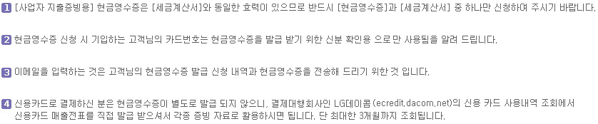 조세특례제한법 제126조의 2, 제26조의 3, 동법 시행령 제121조의 2,3에 의해 적법한 절차(국세청고시 제2004-6)에 따라 인터넷을 통해 현금영수증을 발급하고 있습니다. 신청하신 현금영수증은 고객님의 이메일 주소로 발송됩니다. 고객님께서는 수신된 현금영수증의 내용을 확인하고 바로 출력하여 사용하시면 됩니다. 만약 기재된 내용이 사실과 다를 경우에는 반려할 수 있습니다.